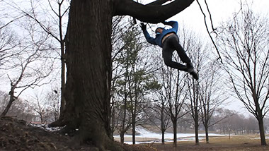 The piece Fall (2013) is a looping depiction of a man falling out of a tree. The loop is cut in such a way so that we only see from the moment he loses his last grip on the tree until the moment before he starts to exit the frame. He is forever caught mid-air, never landing. It is a meditation on control, loss, and loss of control. The character is endlessly looping, with a graceful turn that leaves his level of danger or safety ambiguous.